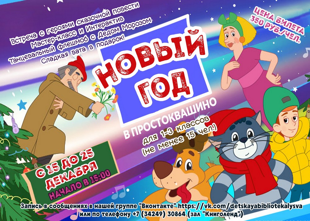 Приглашаем ребят 1-3 классов в волшебную атмосферу любимой сказки! В библиотеке пройдёт праздничное мероприятие по мотивам сказочной повести«Простоквашино», где каждый станет героем весёлого новогоднего приключения.